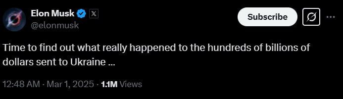 "Пришло время узнать, что на самом деле произошло с сотнями миллиардов долларов, отправленных на Украину..."