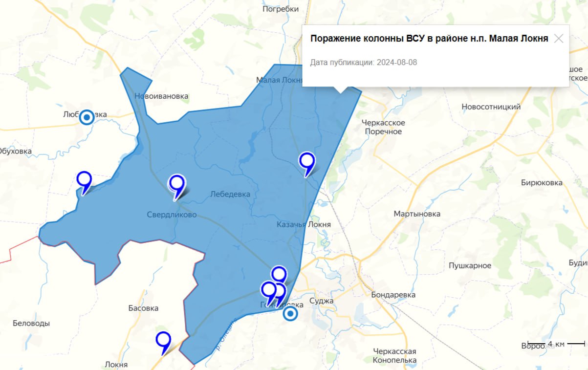 Украинская сторона приводит карту, куда по их мнению могли продвинуться ВСУ, вполне очевидно, что протянувшиеся “клешни” не могут быть свидетельством захваченной территории, так как снабжение по ним легко перерезать - это лишь продвижение отдельных ДРГ.