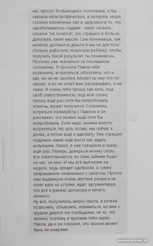 — Его мать начала: прости, извини. Пообещала, что сама будет платить по кредиту. Написала расписку, что это она брала у меня деньги через своего сына. Какое-то время она со скрипом платила по кредиту. Я ей звонил, напоминал, а она мне: «Я на даче, здесь плохая связь. Поговорим потом». Было такое, что я звонил ей, а она: «Я в Питере, позвоню потом». То есть на поездки деньги у нее были?