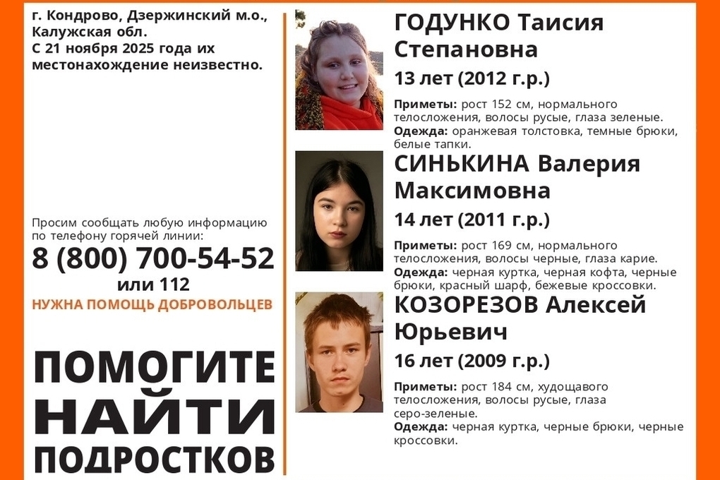 Другой пропавшей 14 лет. Валерия Синькина, ростом 169 сантиметров и нормального телосложения, была одета в черную куртку, черную кофту, черные брюки, красный шарф и бежевые кроссовки. У девочки черные волосы и карие глаза.