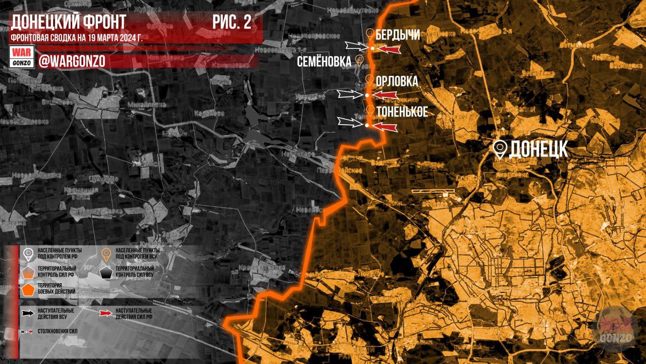 На Донецком фронте ожесточённые бои на линии Тоненькое-Орловка-Бердычи. ВС РФ продолжают теснить противника, но быстрыми продвижение российских войск назвать нельзя. Во-первых это связанно с ожесточённым сопротивлением, которое оказывает ВСУ на этом участке, а во-вторых – с действиями руководства ВС РФ, которые стремятся сохранить личный состав, по возможности избегая лобовых атак. (Рис. 2)