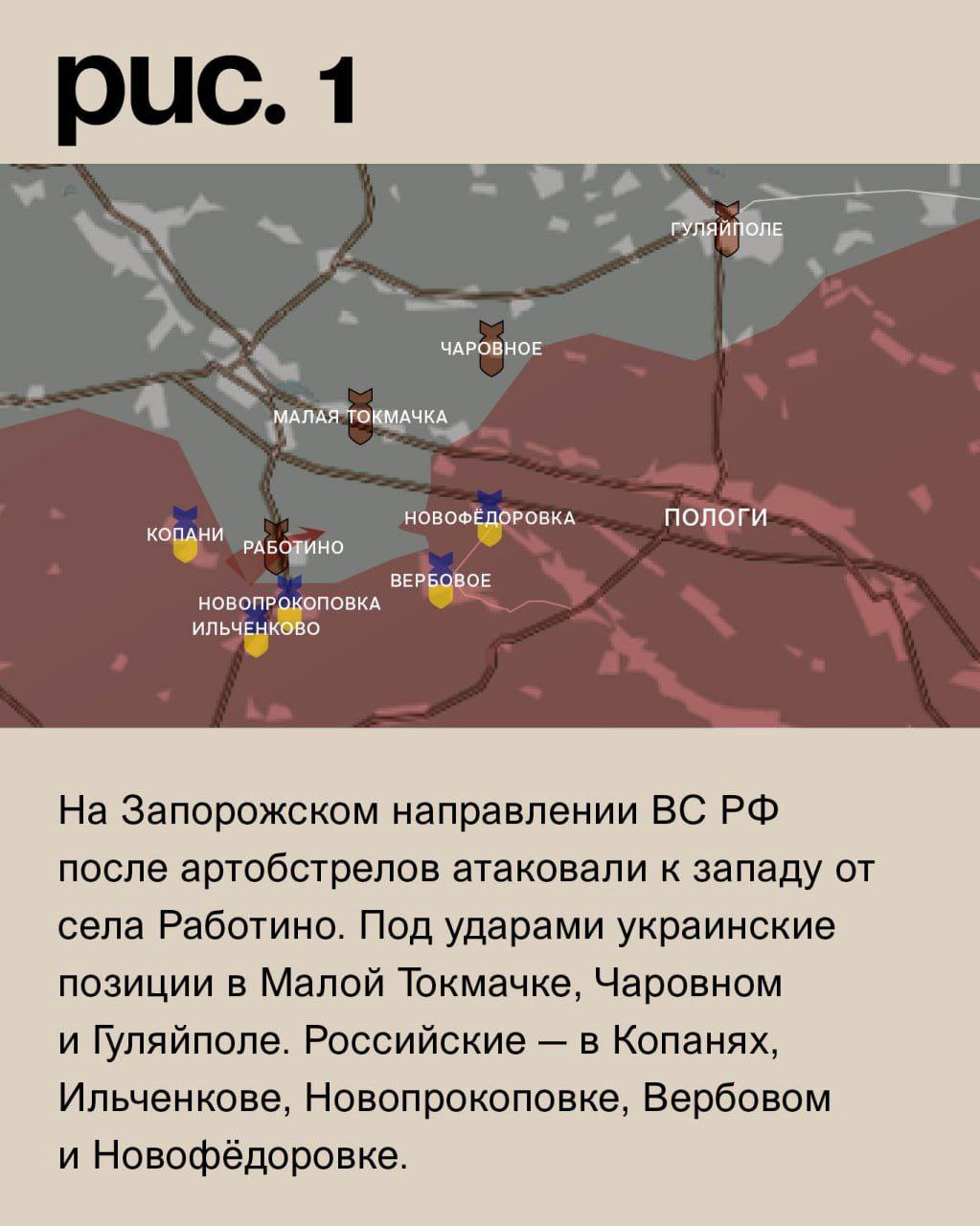 На Запорожском направлении ВС РФ после артобстрелов атаковали к западу от села Работино. Под ударами украинские позиции в Малой Токмачке, Чаровном и Гуляйполе. Российские – в Копанях, Ильченкове, Новопрокоповке, Вербовом и Новофёдоровке. (Рис. 1)