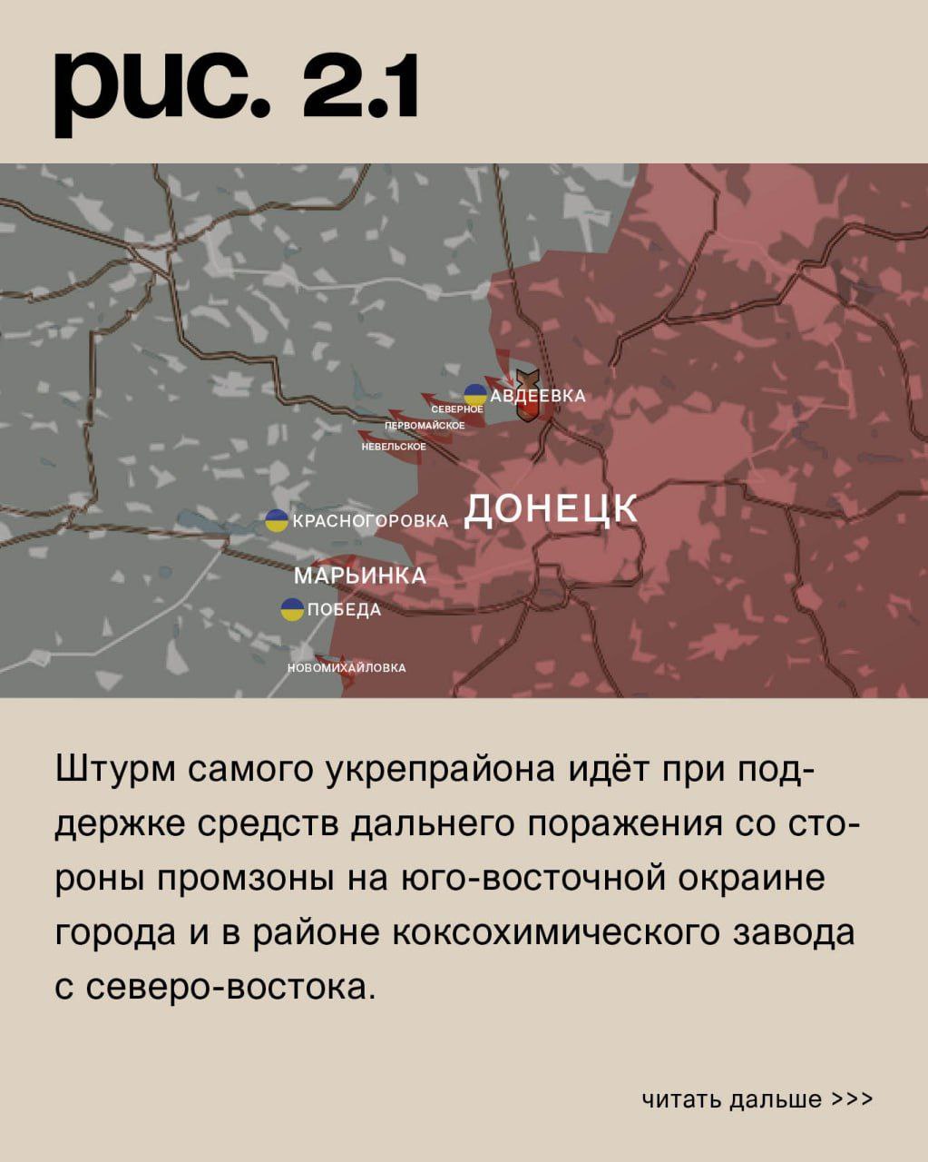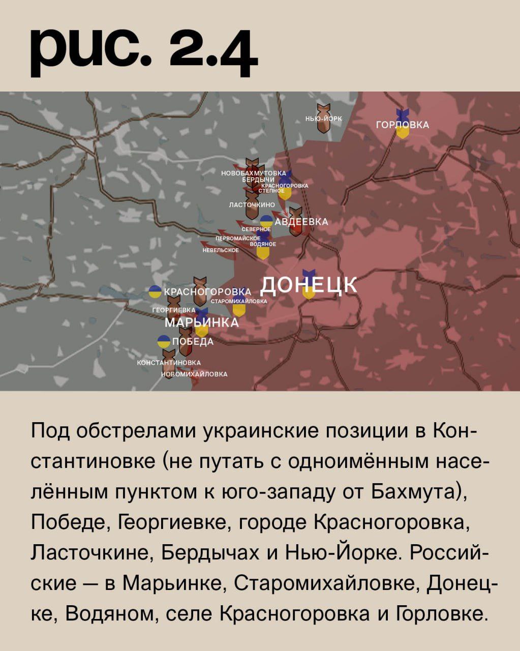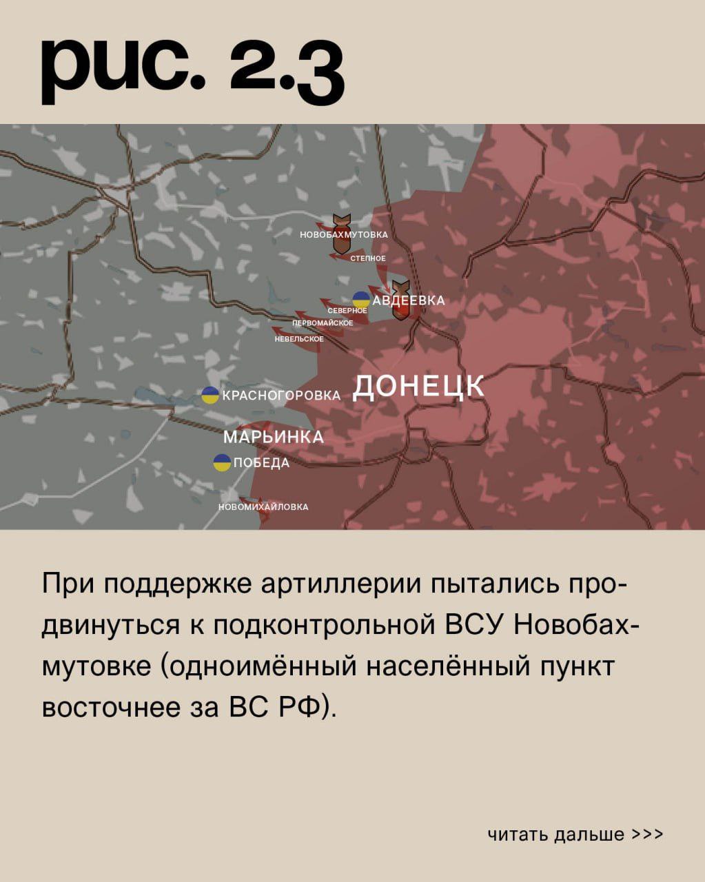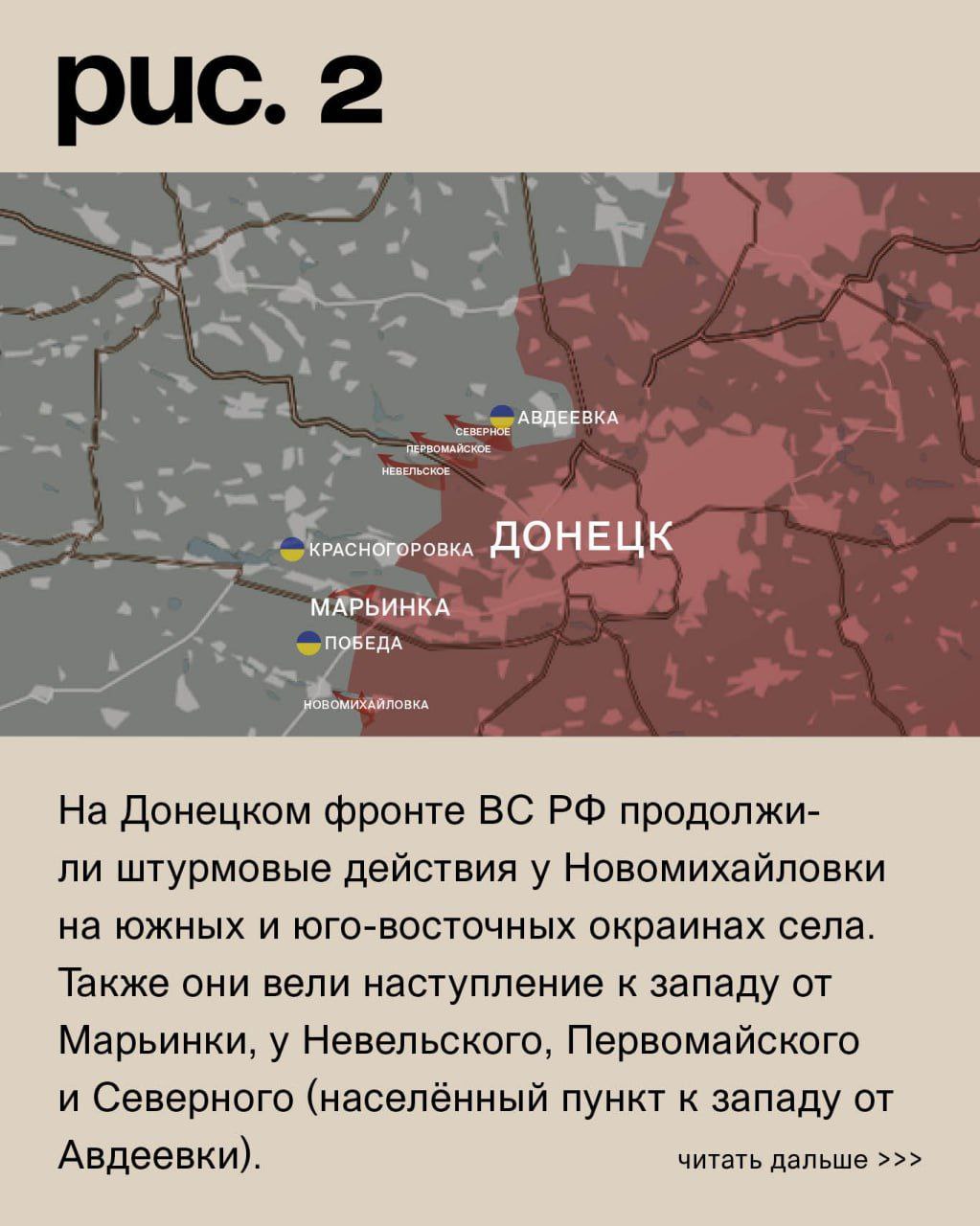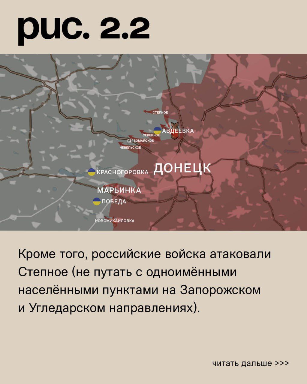 На Донецком фронте ВС РФ продолжили штурмовые действия у Новомихайловки на южных и юго-восточных окраинах села. Также они вели наступление к западу от Марьинки, у Невельского, Первомайского и Северного (населённый пункт к западу от Авдеевки). Штурм самого укрепрайона идёт при поддержке средств дальнего поражения со стороны промзоны на юго-восточной окраине города и в районе коксохимического завода с северо-востока. Кроме того, российские войска атаковали Степное (не путать с одноимёнными населёнными пунктами на Запорожском и Угледарском направлениях). При поддержке артиллерии пытались продвинуться к подконтрольной ВСУ Новобахмутовке (одноимённый населённый пункт восточнее за ВС РФ). Под обстрелами украинские позиции в Константиновке (не путать с одноимённым населённым пунктом к юго-западу от Бахмута), Победе, Георгиевке, городе Красногоровка, Ласточкине, Бердычах и Нью-Йорке. Российские – в Марьинке, Старомихайловке, Донецке, Водяном, селе Красногоровка и Горловке. (Рис. 2)