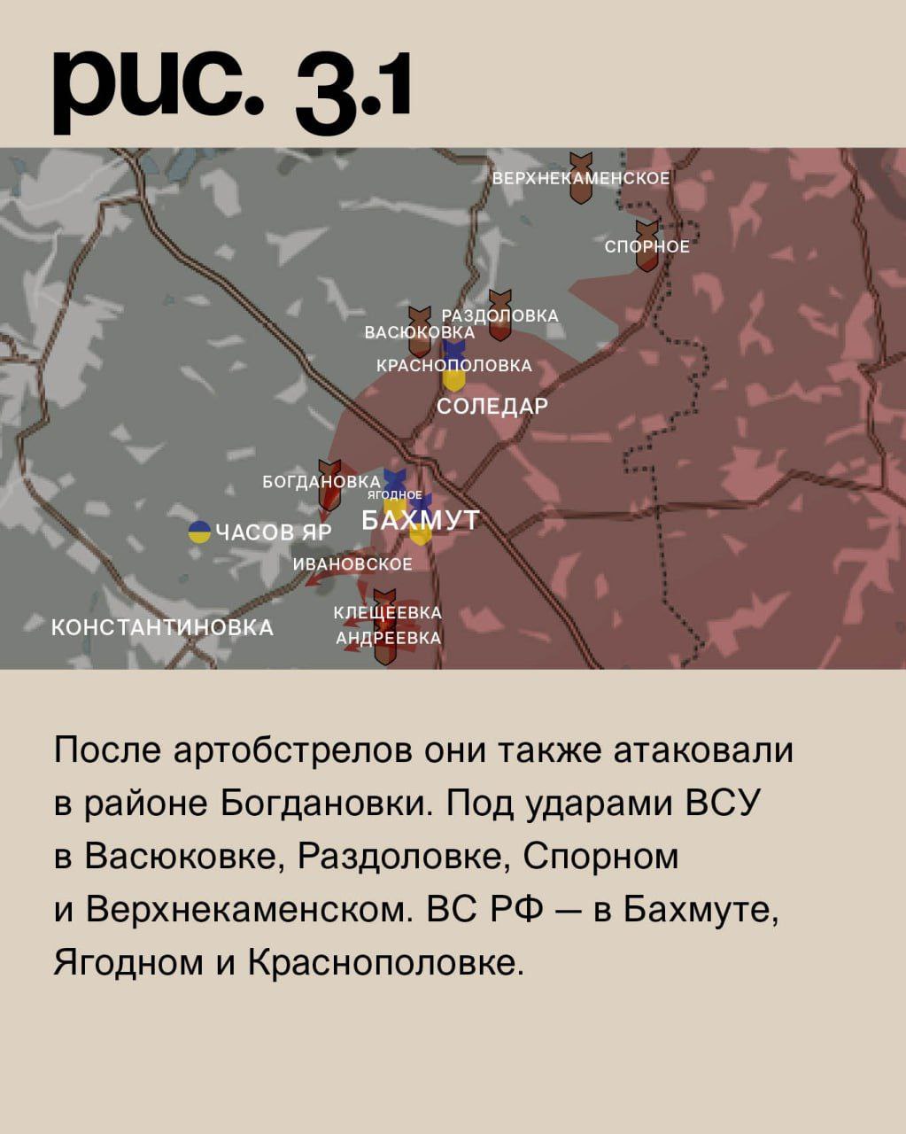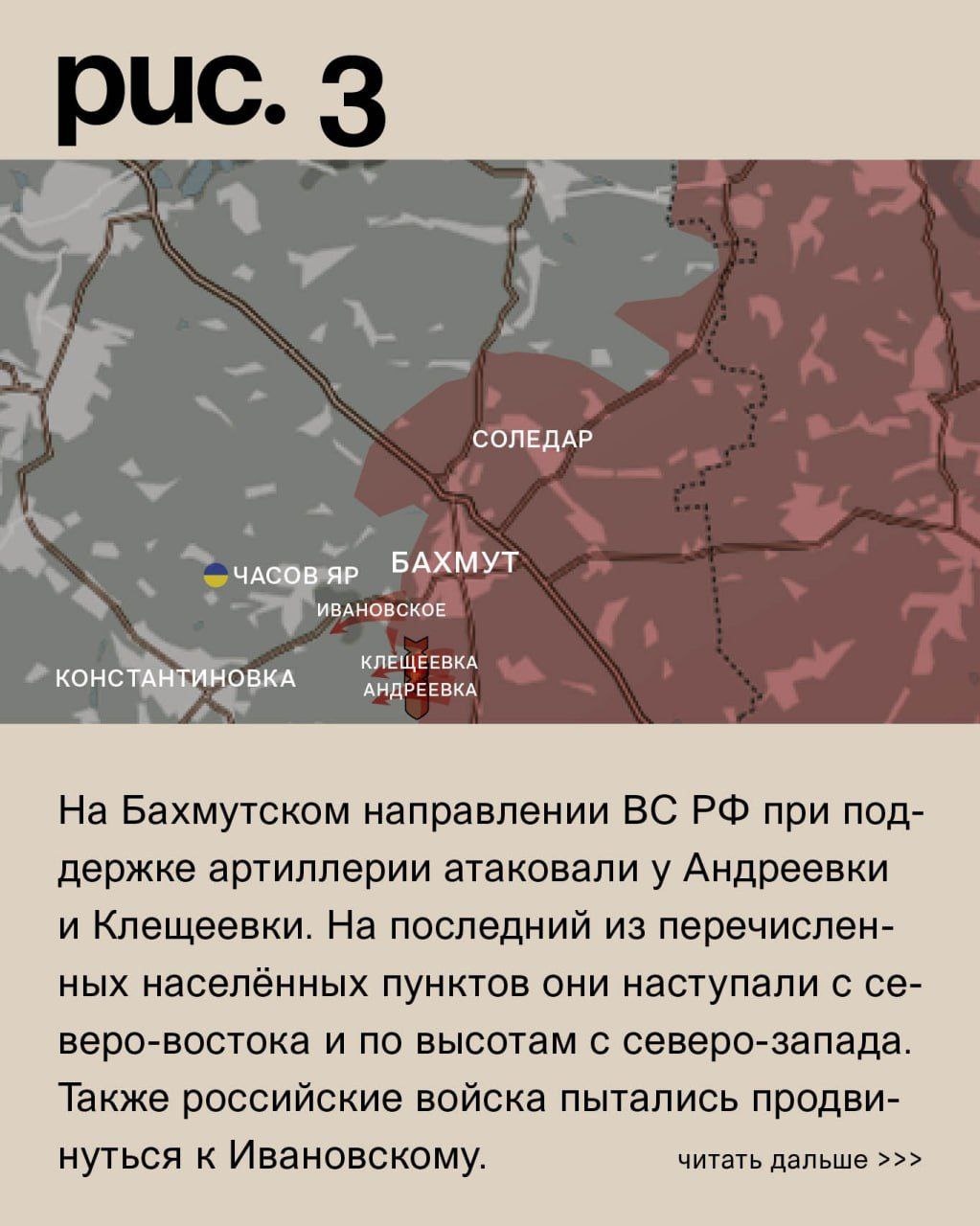На Бахмутском направлении ВС РФ при поддержке артиллерии атаковали у Андреевки и Клещеевки. На последний из перечисленных населённых пунктов они наступали с северо-востока и по высотам с северо-запада. Также российские войска пытались продвинуться к Ивановскому. После артобстрелов они также атаковали в районе Богдановки. Под ударами ВСУ в Васюковке, Раздоловке, Спорном и Верхнекаменском. ВС РФ – в Бахмуте, Ягодном и Краснополовке. (Рис. 3)