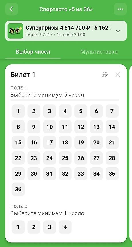 Страница лотереи «Спортлото «5 из 36»». Открытка вкладка «Выбор чисел»