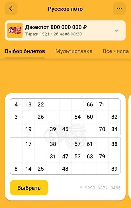 В билете – два поля, каждое из которых содержит 15 чисел в промежутке от 1 до 90. Комбинации цифр готовы – необходимо просто купить билет с приглянувшейся. Цена одной карточки – 150 рублей. Розыгрыши проводятся раз в неделю по воскресеньям, в 8:20 (здесь и далее – время МСК).