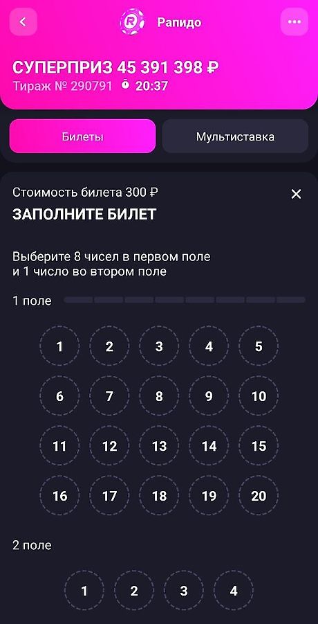Комбинацию в билете вы выбираете сами. На первом игровом поле – цифры от 1 до 20, на втором – от 1 до 4. Нужно выбрать 8 чисел на первом поле и 1 число – на втором. Это минимальная комбинация, но можно сделать развернутую ставку, выбрав более чисел. Соответственно, возрастет и цена.