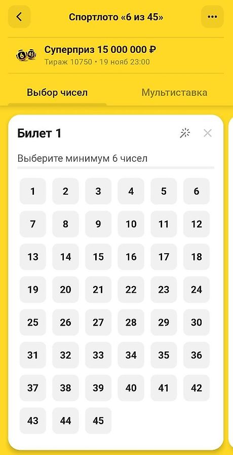 Страница лотереи «Спортлото «6 из 45»». В билете нужно выбрать минимум 6 чисел