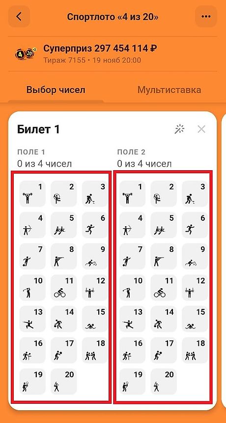 Страница лотереи «Спортлото «4 из 20»». В каждом из полей (левом и правом, выделены красным цветом) нужно выбрать минимум по 4 числа