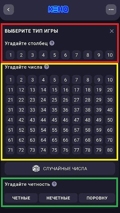 Страница лотереи «КЕНО» в приложении «Столото». На вкладке «Билеты» нужно выбрать тип игры и отметить значения в соответствующих полях: столбец (поле выделено красным), от 1 до 10 чисел (желтым) или четность (зеленым)