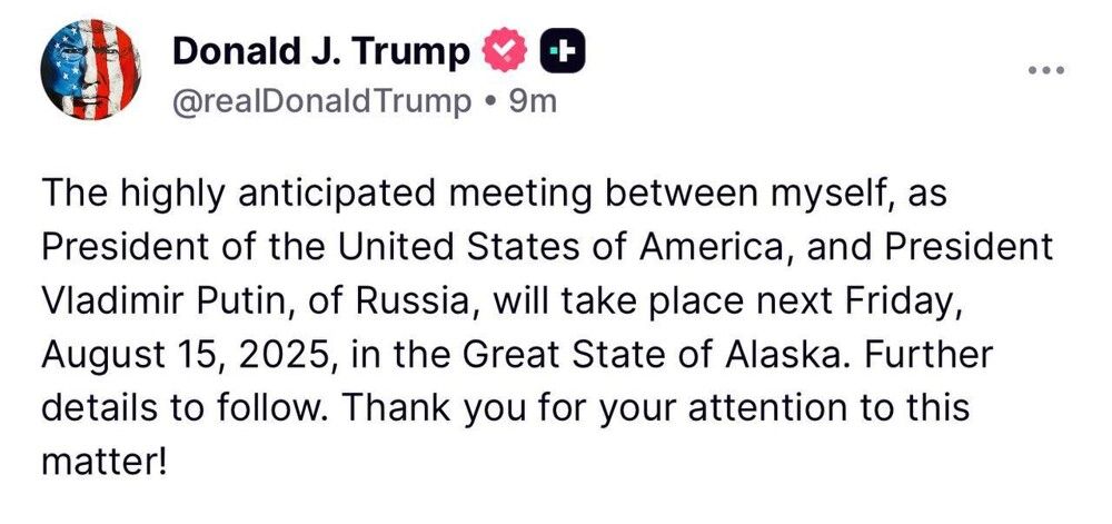 Трамп сам анонсировал встречу 8 августа через Truth Social, назвав её "ожидаемым событием" и выбрав Аляску как точку на карте.