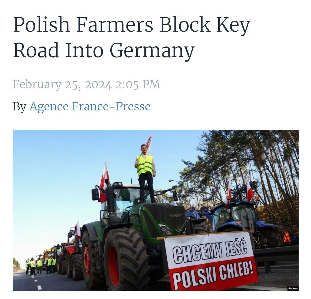 Это протест уже не по поводу Украины, а против правил и налогов ЕС, пишет AFP. Таким образом они солидаризировались с общеевропейскими акциями фермеров, которые выступают против чрезмерных экологических ограничений и конкуренции со стороны дешевого импорта из-за пределов ЕС.