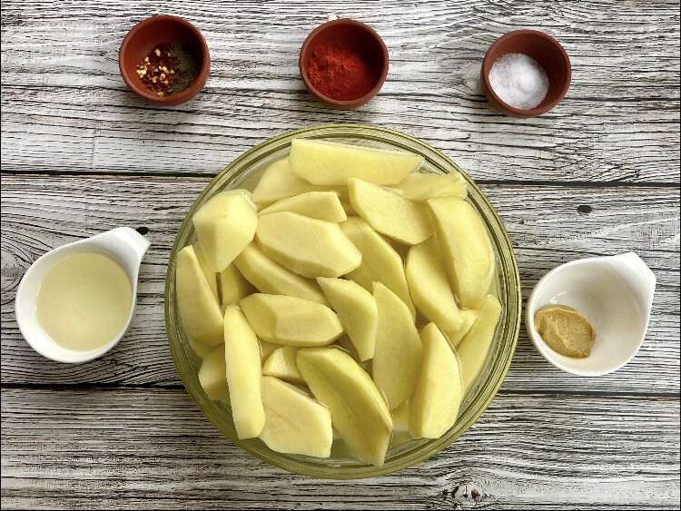 Перекладываем картошку в миску, вливаем к ней три столовых ложки растительного масла, добавляем чайную ложку паприки, черный и острый перец, можно немного сушеного чеснока (или сухих ароматных трав) и соль по вкусу. А также — чайную ложку горчицы. Все хорошо перемешиваем — руками удобнее всего.