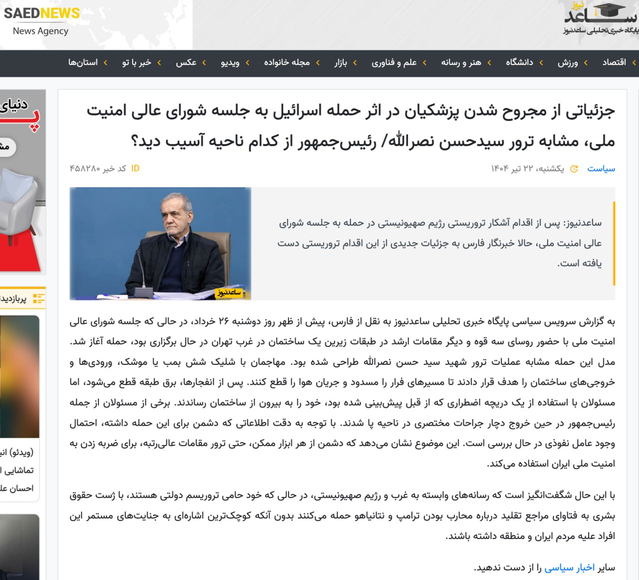SaedNews сообщает о покушении на президента Ирана Масуда Пезешкиана, произошедшем во время 12-дневной ирано-израильской войны. В результате атаки президент получил ранение ноги.