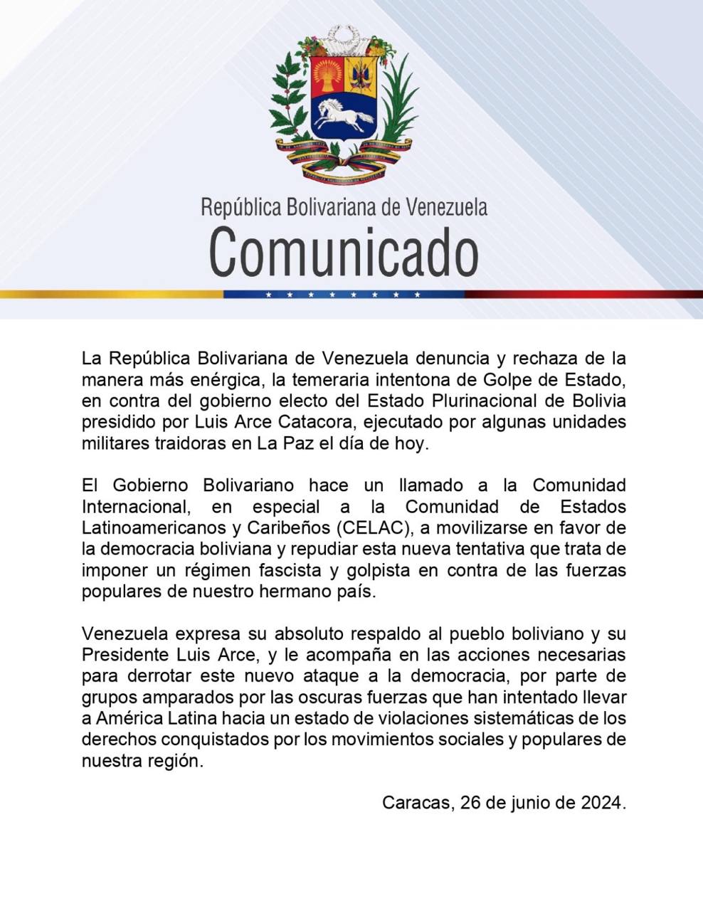 Боливарианская Республика Венесуэла осуждает и отвергает безрассудную попытку государственного переворота против избранного правительства Многонационального Государства Боливия под председательством Луиса Арсе Катакоры, осуществленную «некоторыми воинскими частями-предателями» в Ла-Пасе.