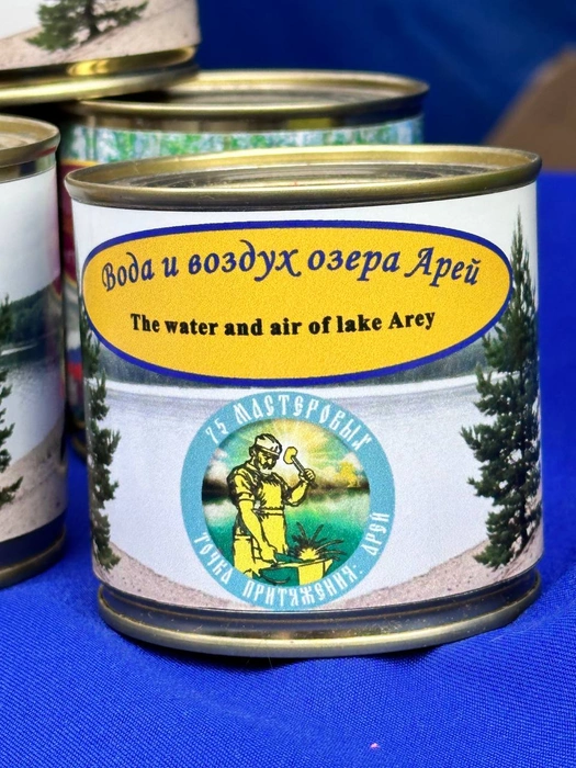 Банки брендированные с яркими этикетками, на русском и английском написано «Вода и воздух озера Арей». Среди них также есть банка с воздухом Забайкалья.