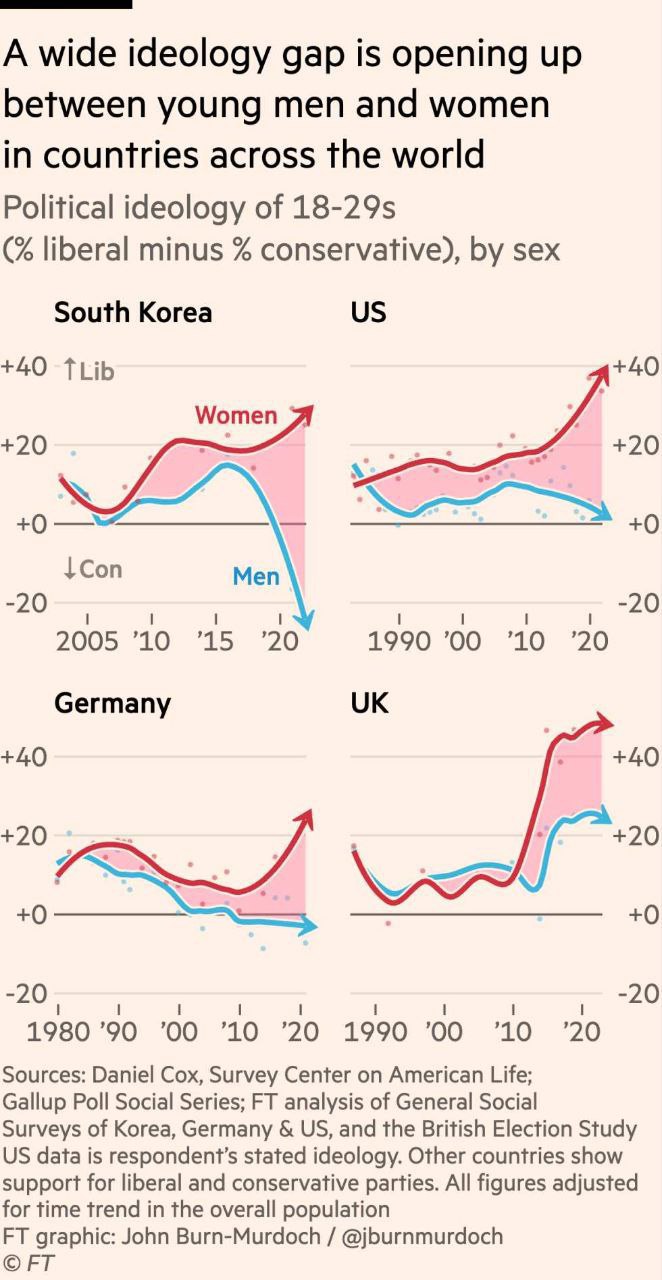 Читатель попросил меня прокомментировать исследование, опубликованное The Financial Times, где фиксируется рост расхождения в политических взглядах между полами.