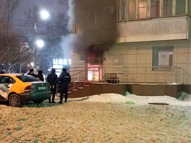 Очевидцы говорят, что кто-то подорвал странный предмет у входа в банк, после взрыва начался пожар. Подписчики телеграм-каналов пишут, что уже есть один пострадавший. На фото видно, что полиция уже кого-то задержала.
