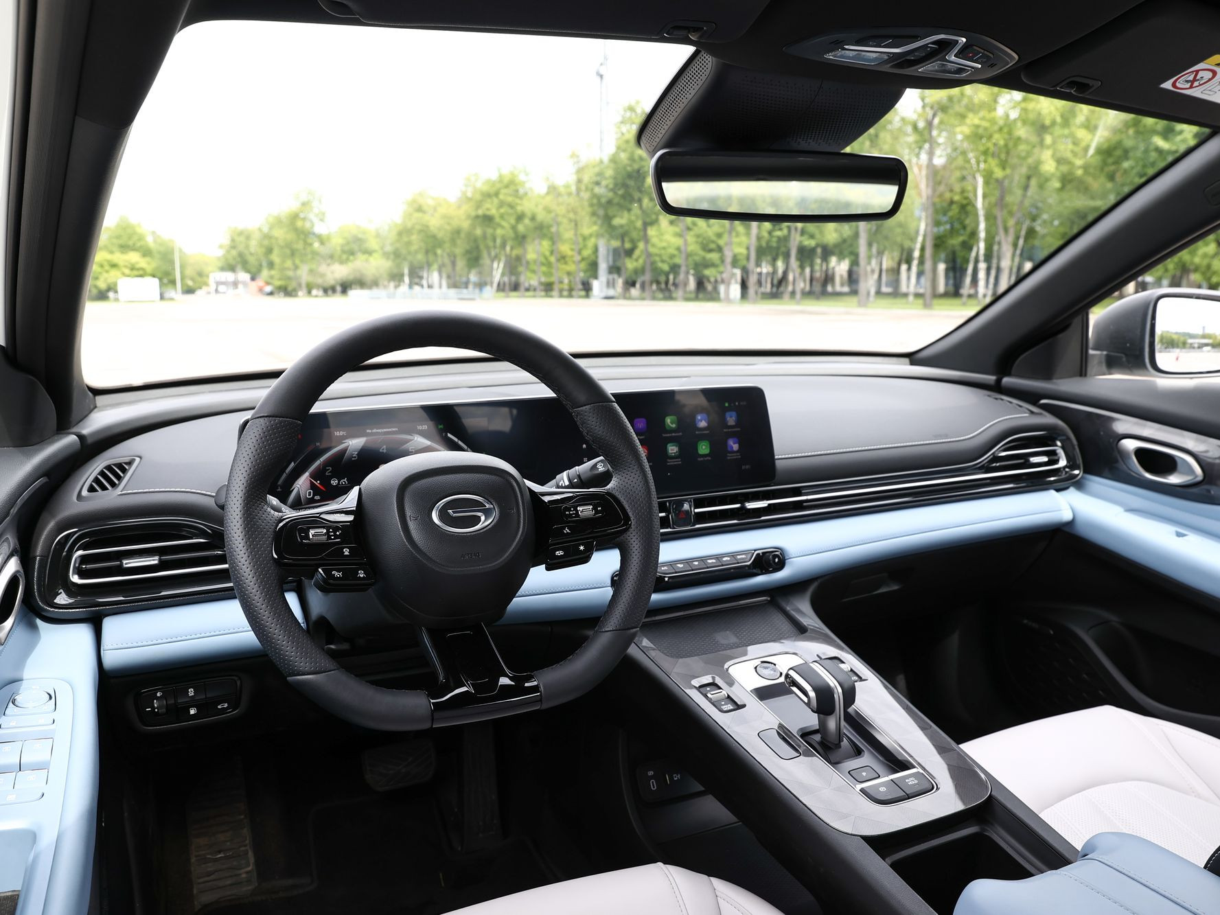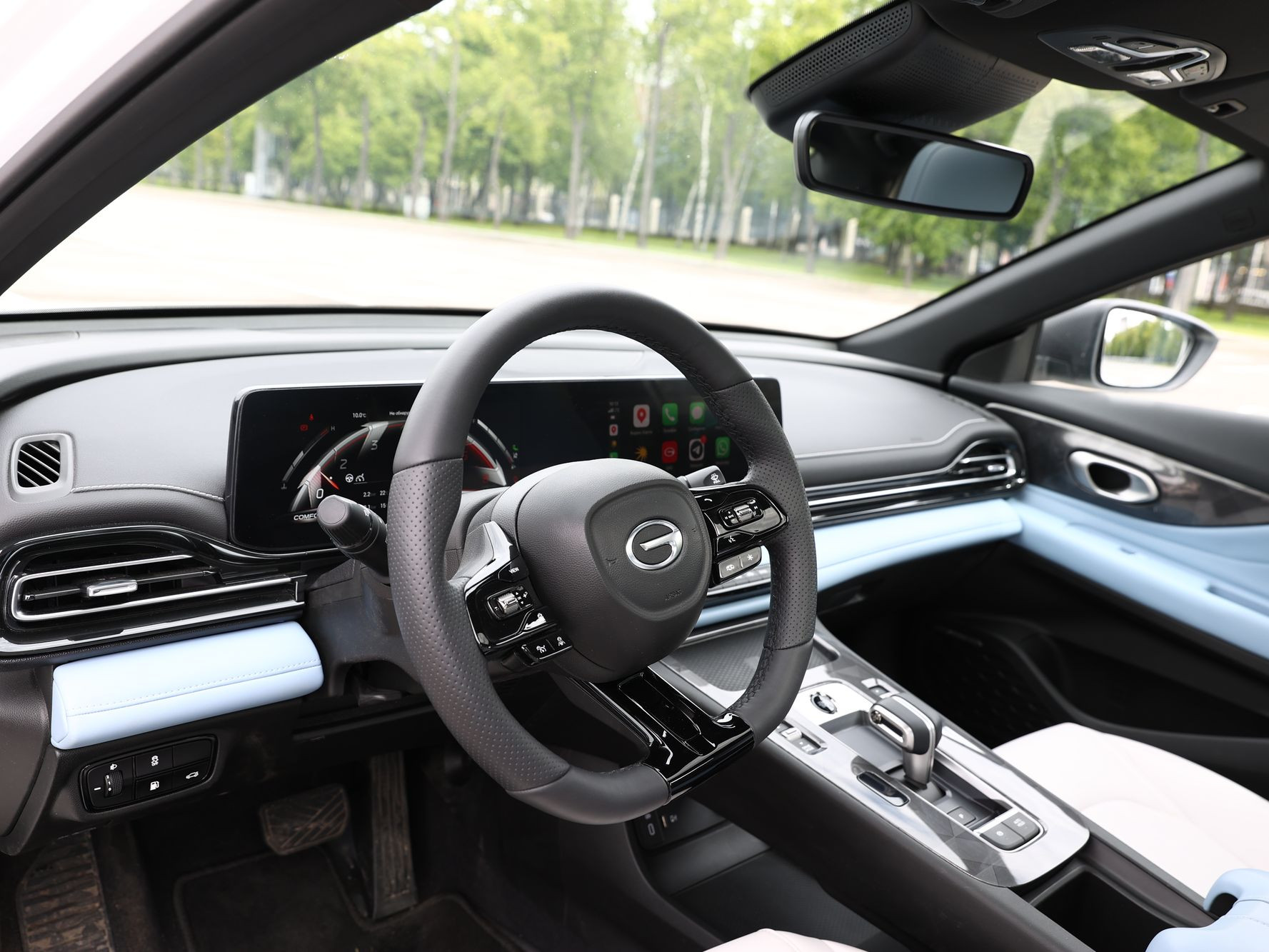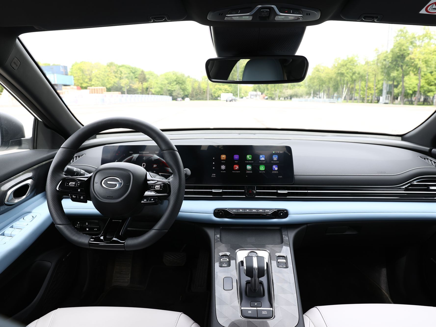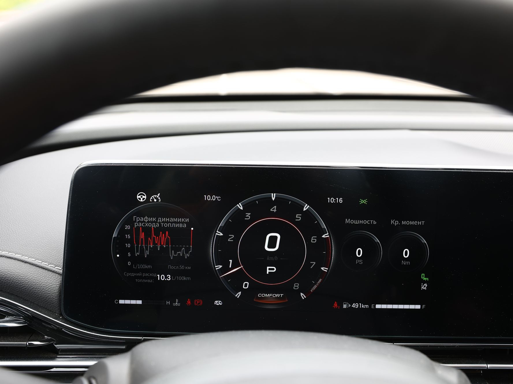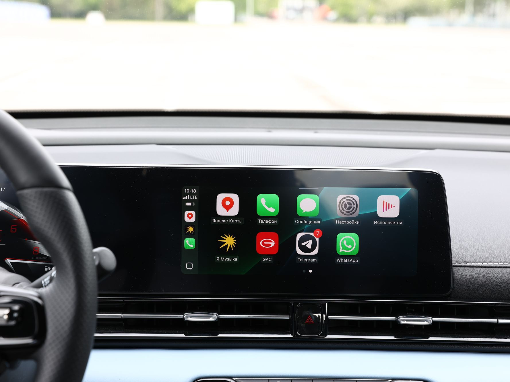 Мультимедийная система с 10,25-дюймовым тачскрином обладает не всегда понятной логикой интерфейса и традиционно для моделей GAC забавляет ошибками перевода – «рулетка» вместо руля, «выход из здания», «звуковая волна выхлопа», «крутящий момент мощности»… Чего? «Моя твоя не понимать». Но экран живо реагирует на касания, к этому претензий нет.
