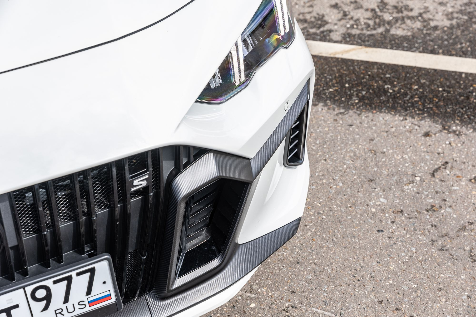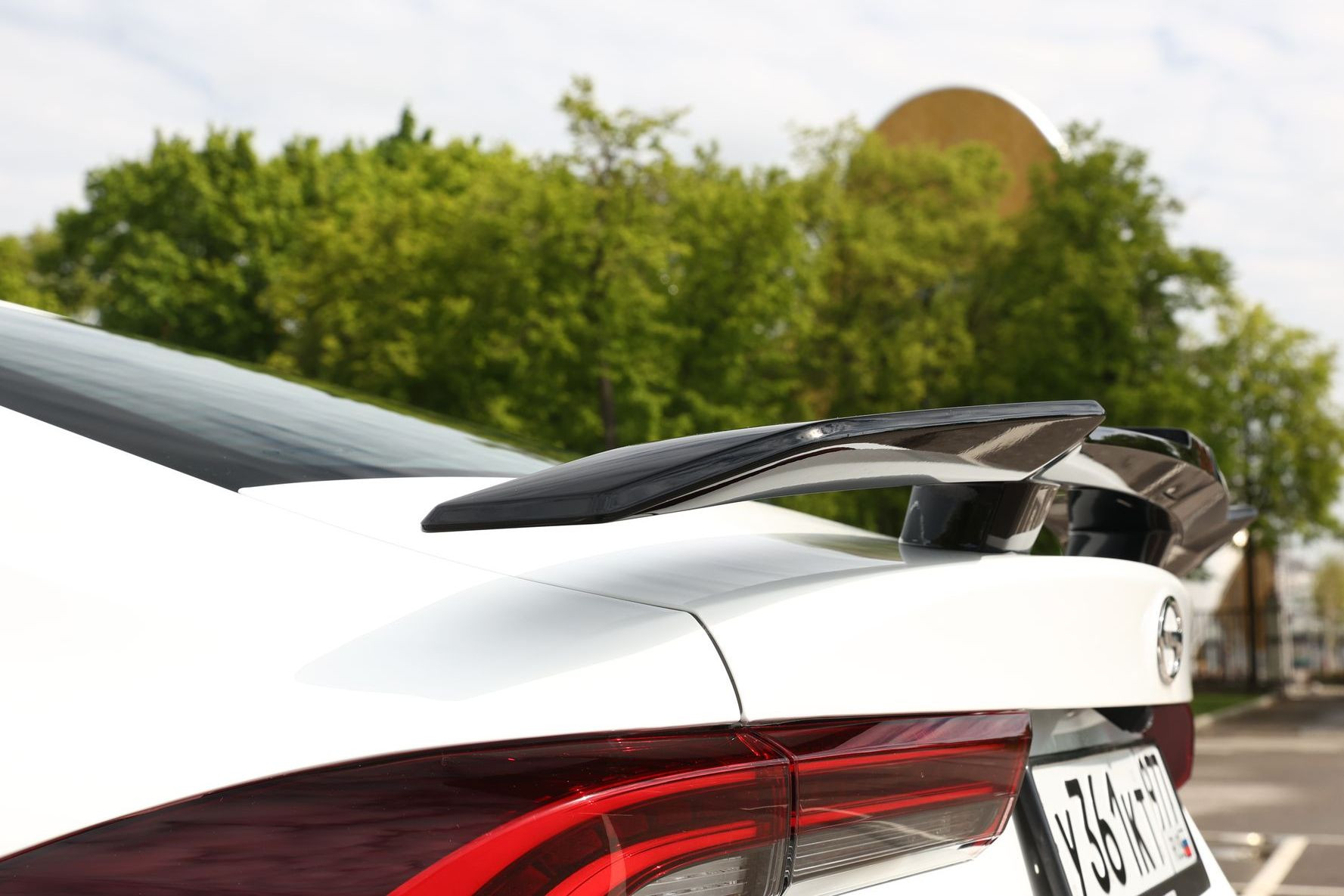 Рисунок под углеволокно также можно найти на корпусах зеркал и псевдодиффузоре в юбке заднего бампера. Даже странно, что самый эффектный элемент экстерьера – развитое антикрыло на ножках – сделали из обычного чёрного пластика, а не заклеили его в «карбон». Как и накладки на порогах. Ну и жаль, что цвета кузова такие скучные – чёрный, серый, серебристый и белый. Ни одного «спортивного» оттенка.