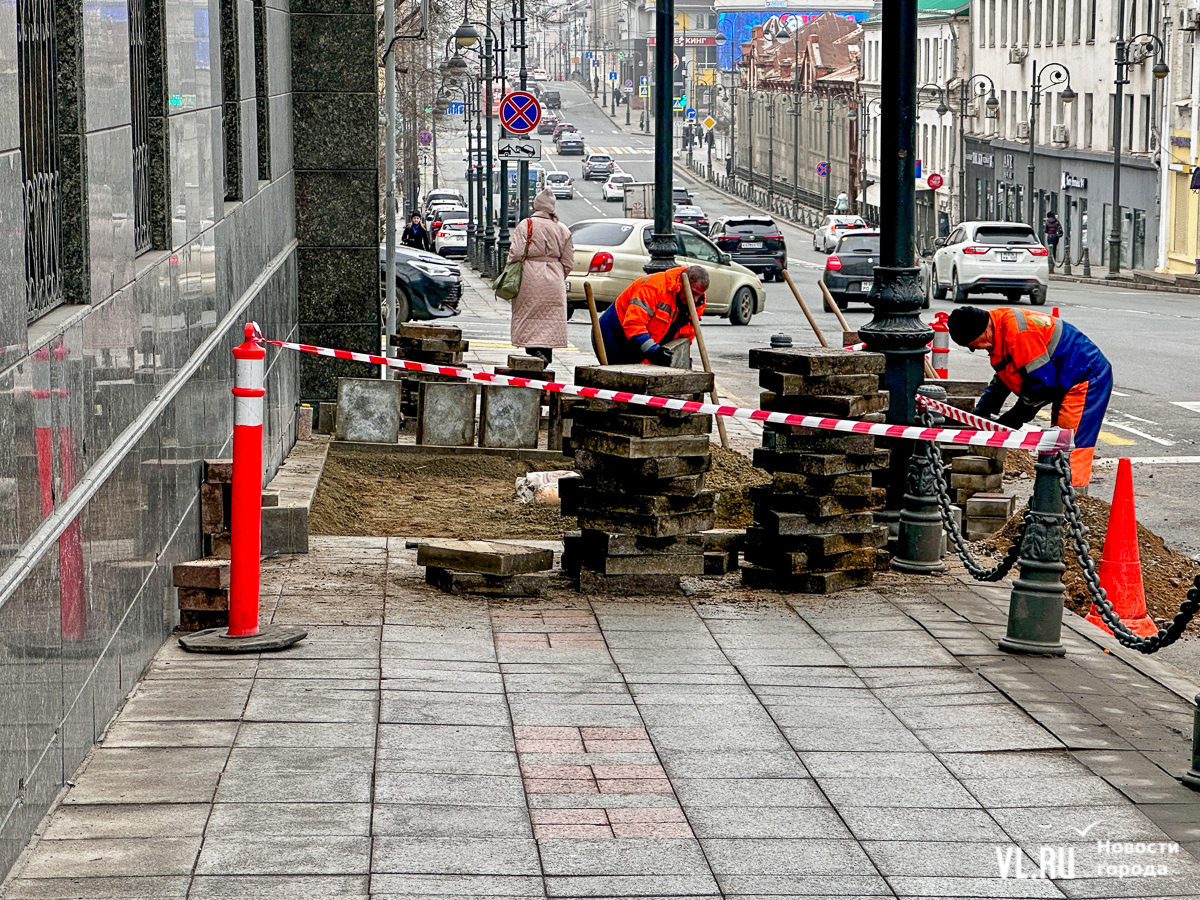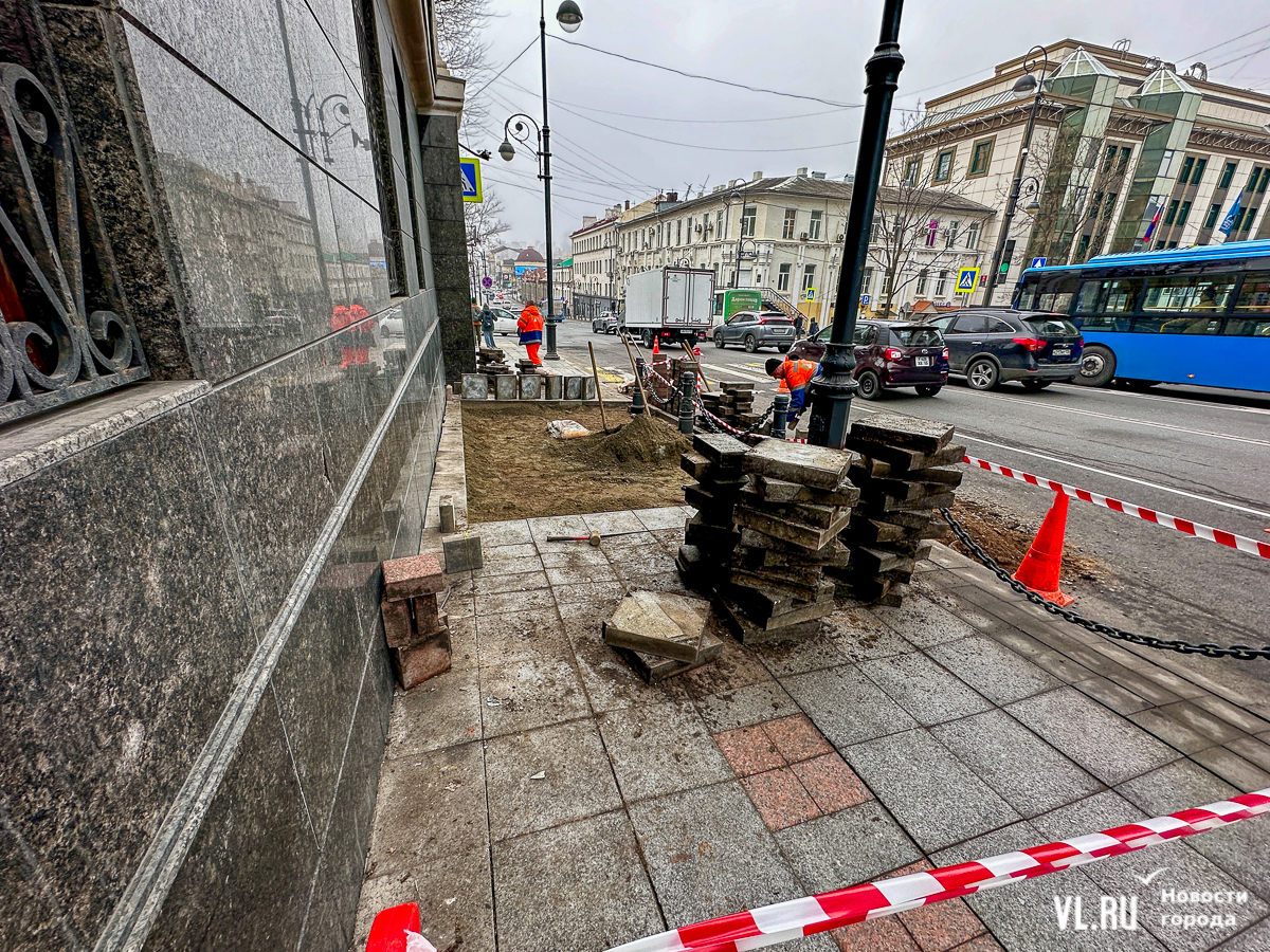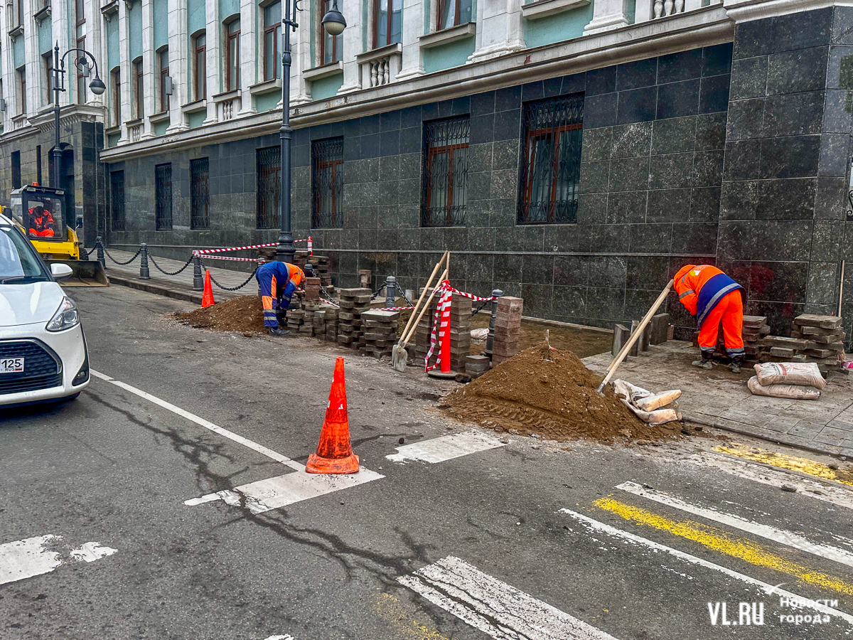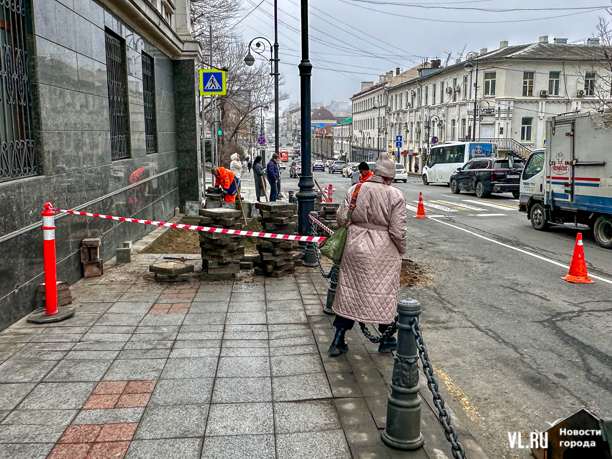 Меняют плитку возле Алеутской, 44. Из-за этого тротуар и крайняя правая полоса частично перекрыты – на ней стоит мини-погрузчик, который огорожен конусами и дорожными знаками. Пешеходам же, которые идут вниз к «Клеверу», нужно обходить раскопки по проезжей части, огибая спецтехнику и перешагивая через заборчик.