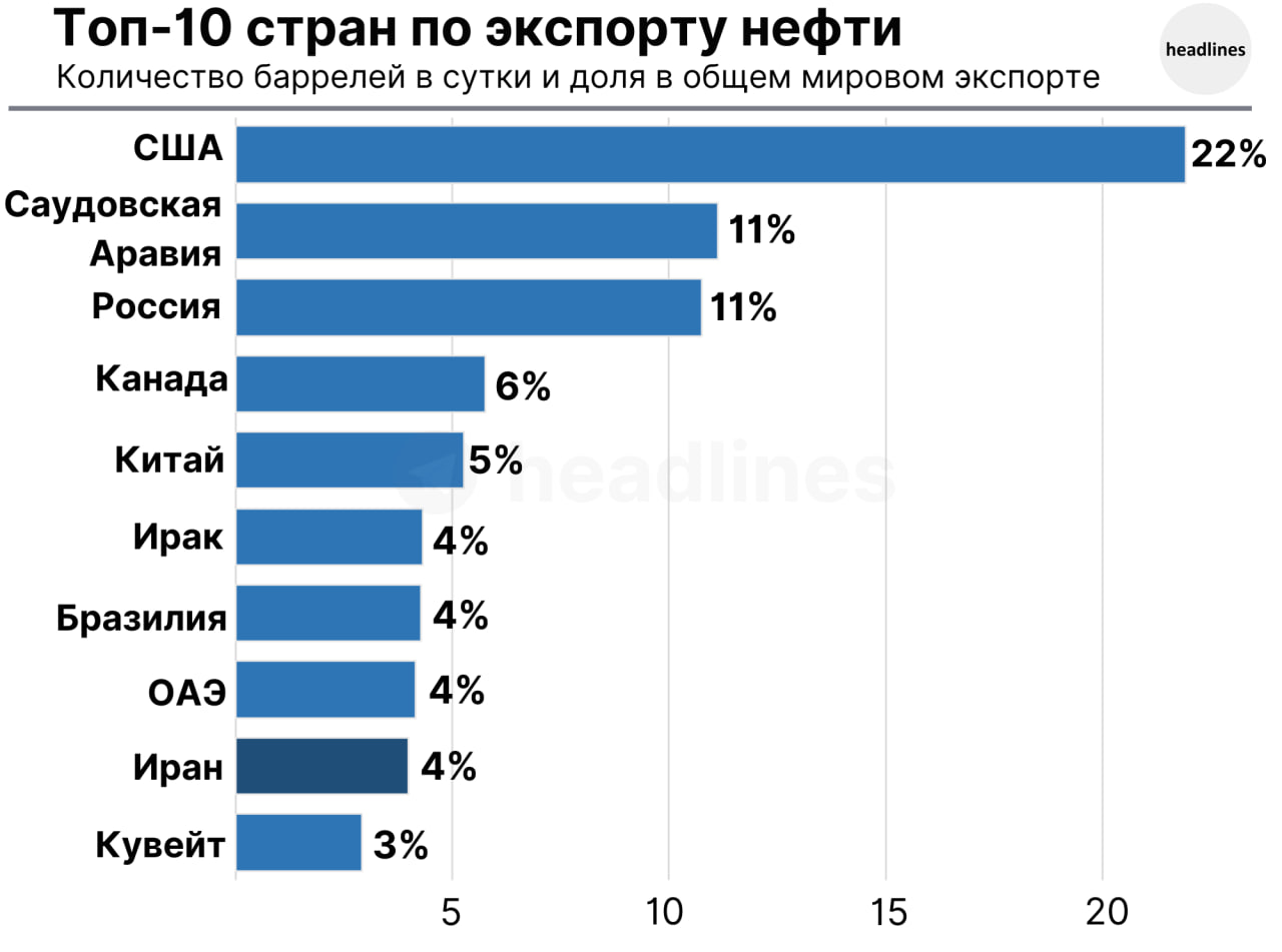 Иран занимает 9-е место в мире, поставляя в среднем около 4-х млн баррелей в сутки. Несмотря на санкционное давление, Тегеран с 2020 г. нарастил поставки в 4 раза. Увеличению экспорта способствовало, что из-за санкций Иран освобожден от сокращения добычи в рамках соглашения ОПЕК+.