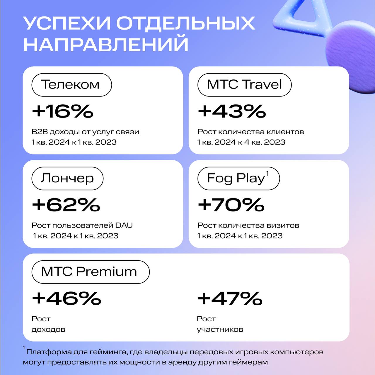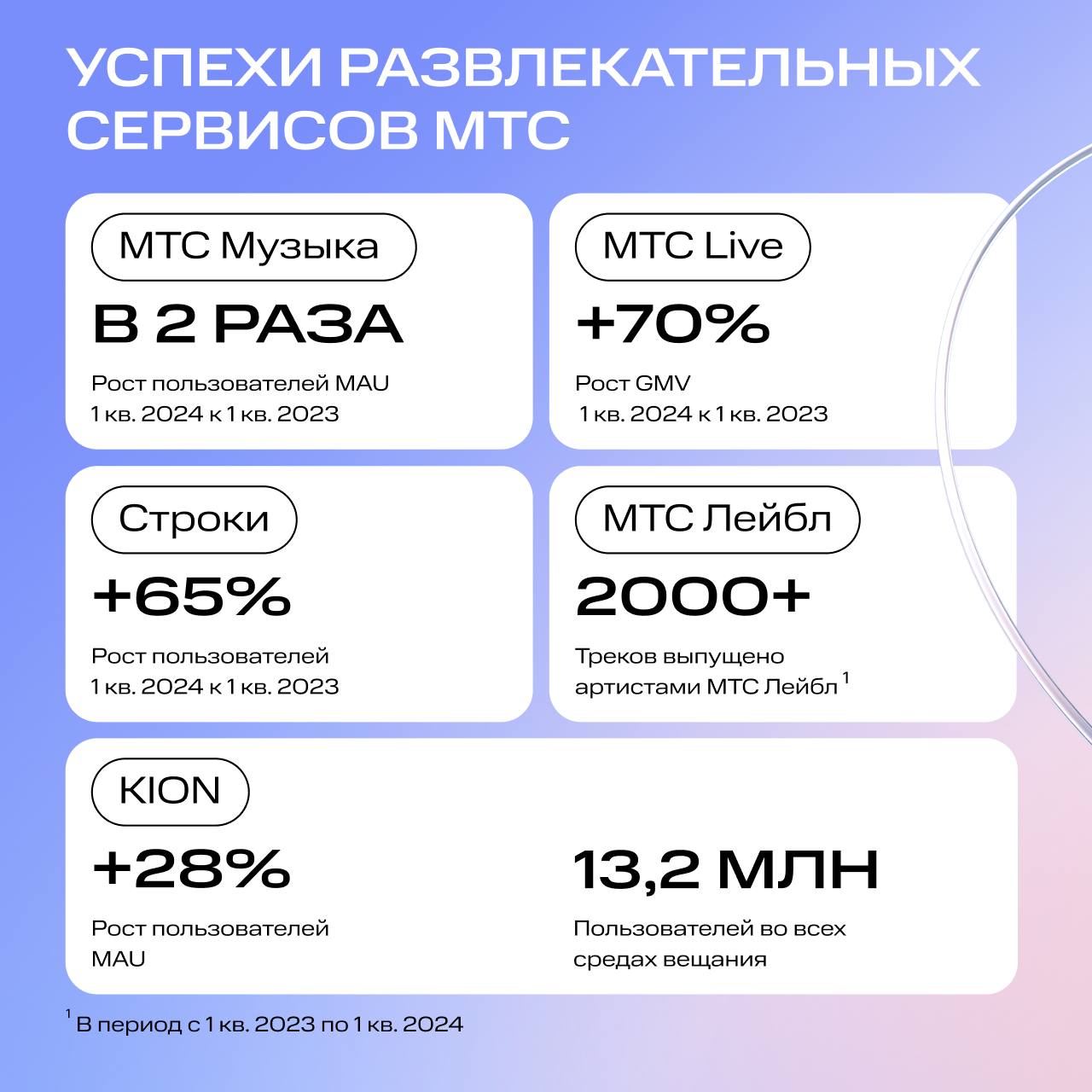 ➕МТС Музыка выросла вдвое по количеству активных пользователей в месяц, продажи МТС Live — на 70% год к году, а у Строк стало на 65% больше платящих пользователей.
