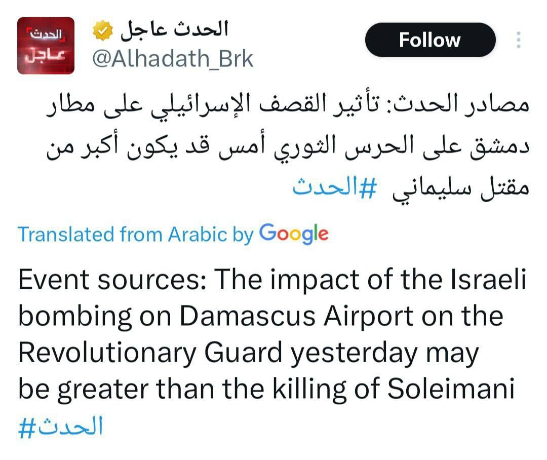 🇮🇱🔴🇸🇾Израильская бомбардировка Дамаска этой ночью называют более успешной, чем убийство Сулеймани (высокопоставленный чиновник КСИР, которого США убили в январе 2020 года)