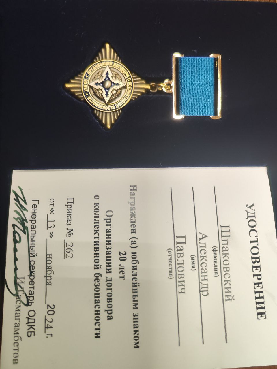 Признателен секретариату ОДКБ за решение о моем награждении нагрудным знаком "20 лет Организации договора о коллективной безопасности".