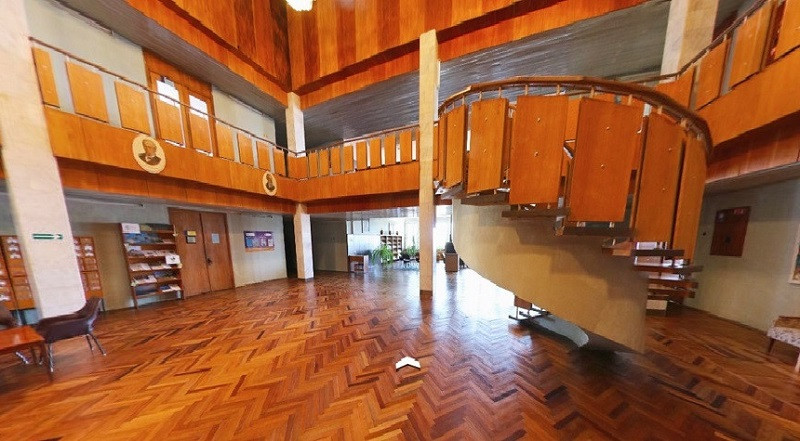Библиотека, построенная в 1982 году по проекту архитектора Е.В. Рыбицкого, считается достойным образцом советского модерна в архитектуре. Знаменита она и оформленным деревом залом каталогов с винтовой лестницей в центре.