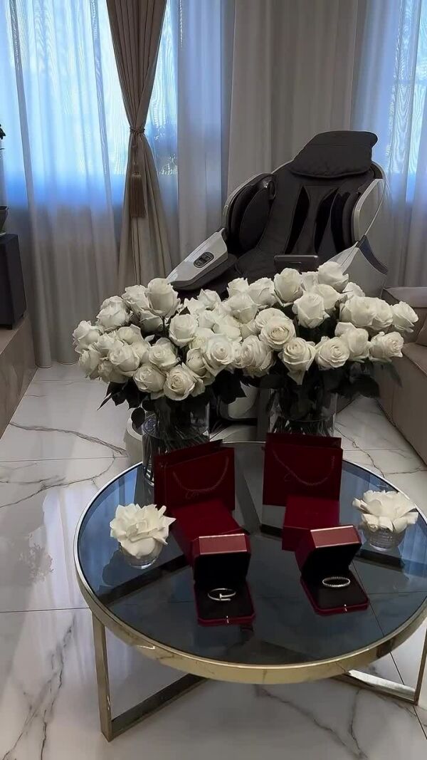 Бизнесмен решил порадовать возлюбленную и выразить благодарность за ожидание третьего малыша. Он украсил дом букетами белых роз, а также воздушными шарами, к которым были привязаны их совместные снимки.