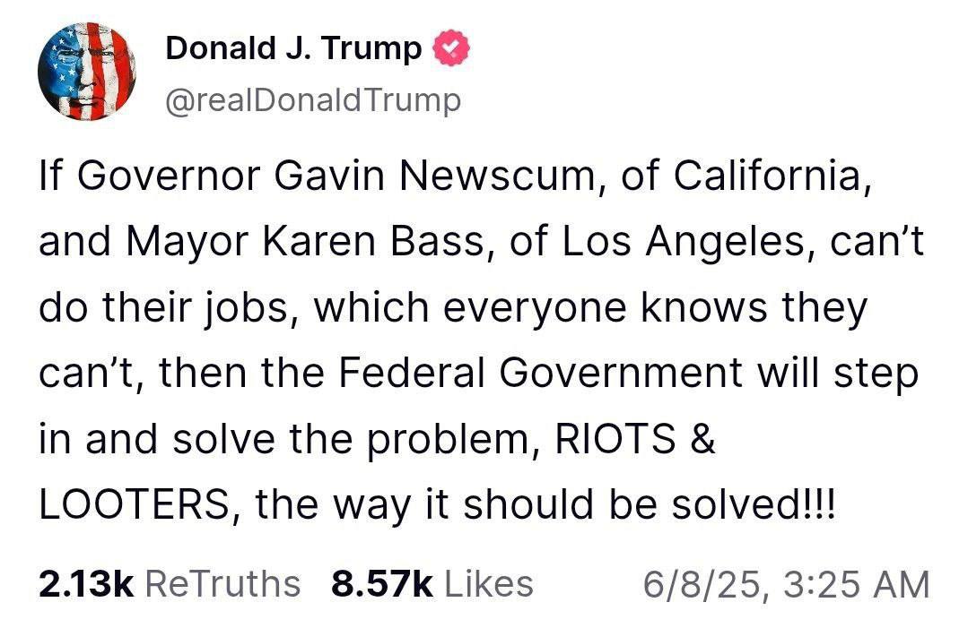 Трамп угрожает руководству Калифорнии. В самое ближайшее время в Лос-Анджелес должна зайти Национальная гвардия, а затем, возможно, и морпехи.