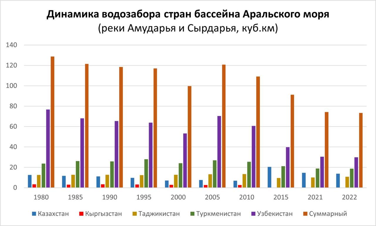 Динамика забора воды из Амударьи и Сырдарьи пятью станами Центральной Азии в разные годы. Фото: из материалов МФСА