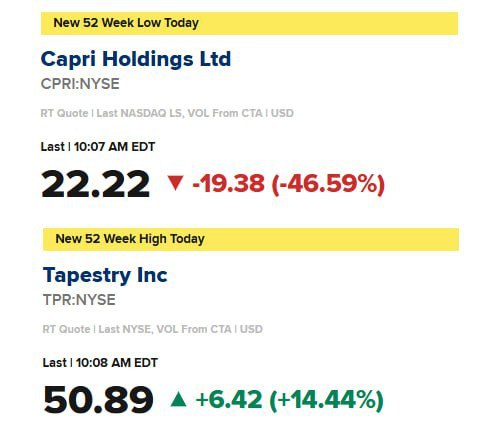 Акции Capri Holdings (материнская компания Michael Kors, Versace, Jimmy Choo) обвалились на 47% из-за запрета судом слияния c Tapestry (компания Coach).