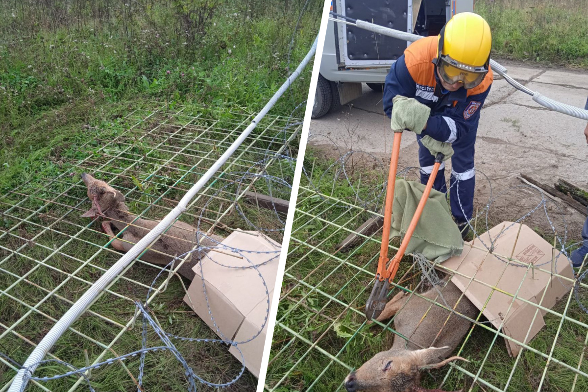 Животное влетело головой в забор, и ее шея застряла между прутьями. Выбраться самостоятельно не получалось. Сотрудники местной спасательной станции выезжали на место и с помощью инструментов вытащили косулю и отпустили ее в лес.