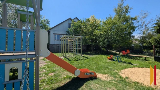 Новый детский игровой комплекс состоит из горок, лестниц и сетки. Кроме того, установили двое качелей и скутер-попрыгунчик. Рядом – спортивный комплекс с турниками и перекладинами.