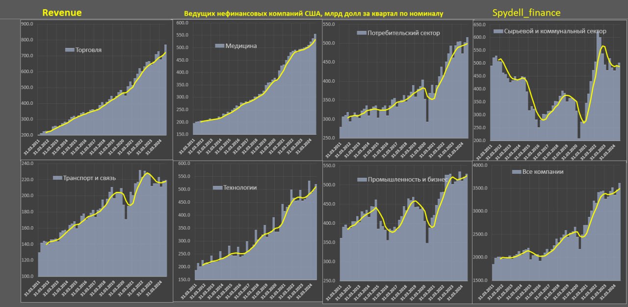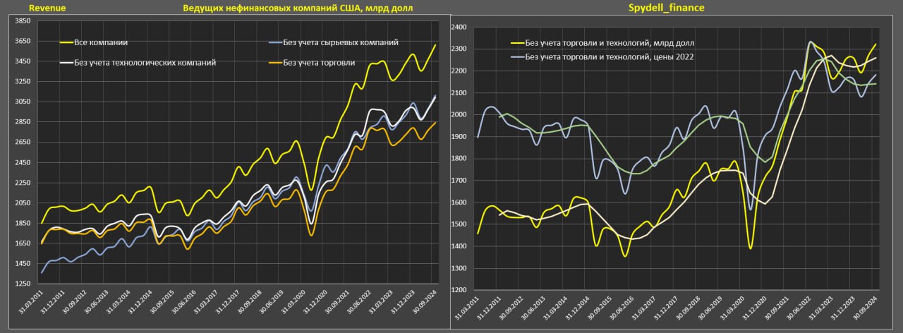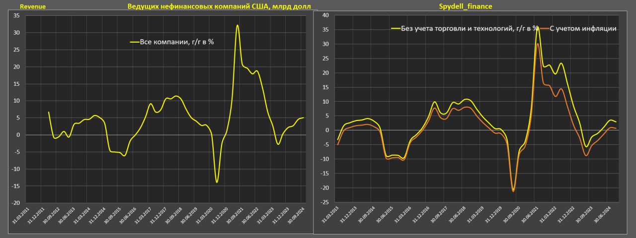 Выручка всех нефинансовых компаний США в 3кв24 (среди тех, которые отчитались) выросла на 5.1% г/г по номиналу и всего +5.4% за два года (3кв24 к 3кв22). С учетом инфляции рост на 2.8% г/г и по нулям за два года.