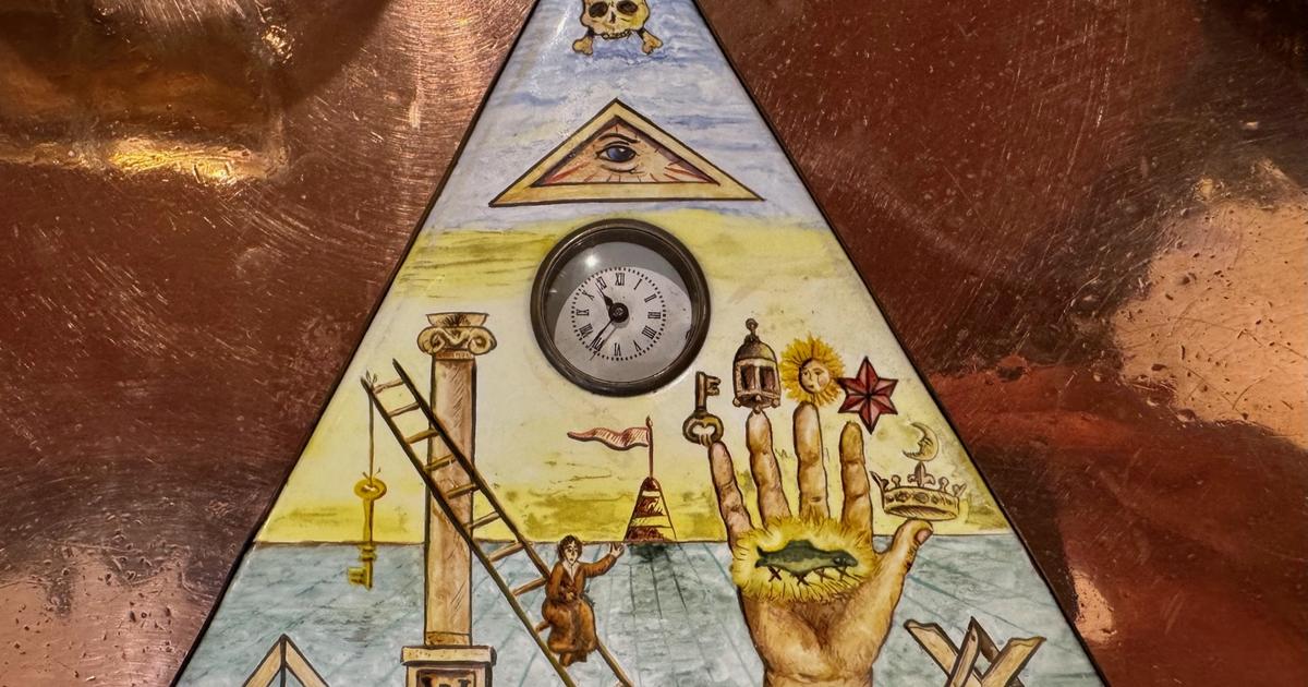 Le plus symbolique des lots horlogers de cette vente dédiée aux objets maçonniques et sans doute une petite pendule (14 x 15 cm) de forme triangulaire émaillée, dont le cadran arbore un riche décor maçonnique : échelle de Jacob, tête de mort, triangle et œil omniscient... Une pièce rare et en bon état estimée 800/900 €.