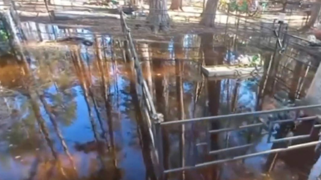 Могилы ушли под воду накануне. По словам местных, затопило свежие захоронения, расположенные в низине в новой части погоста. Потоп сняли на видео.