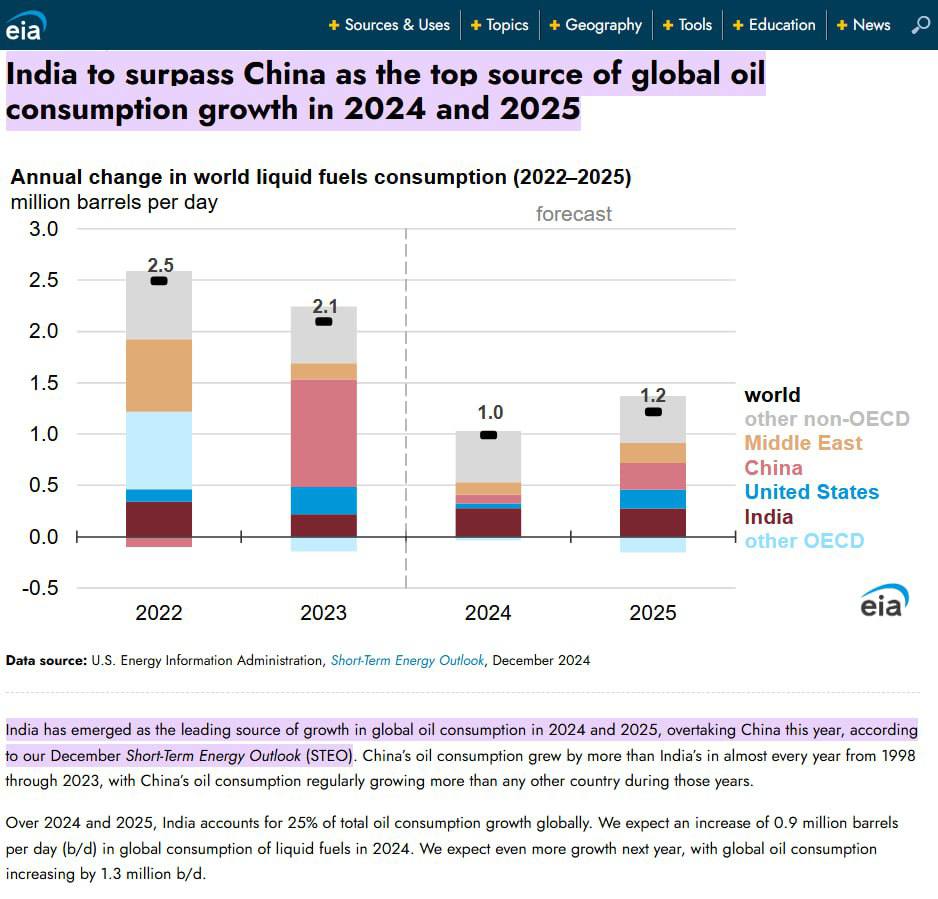 📈 По прогнозам Управления энергетической информации (EIA), к концу 2024 года рост спроса на нефть в Индии впервые превысит рост спроса в Китае и станет самым значительным в мире