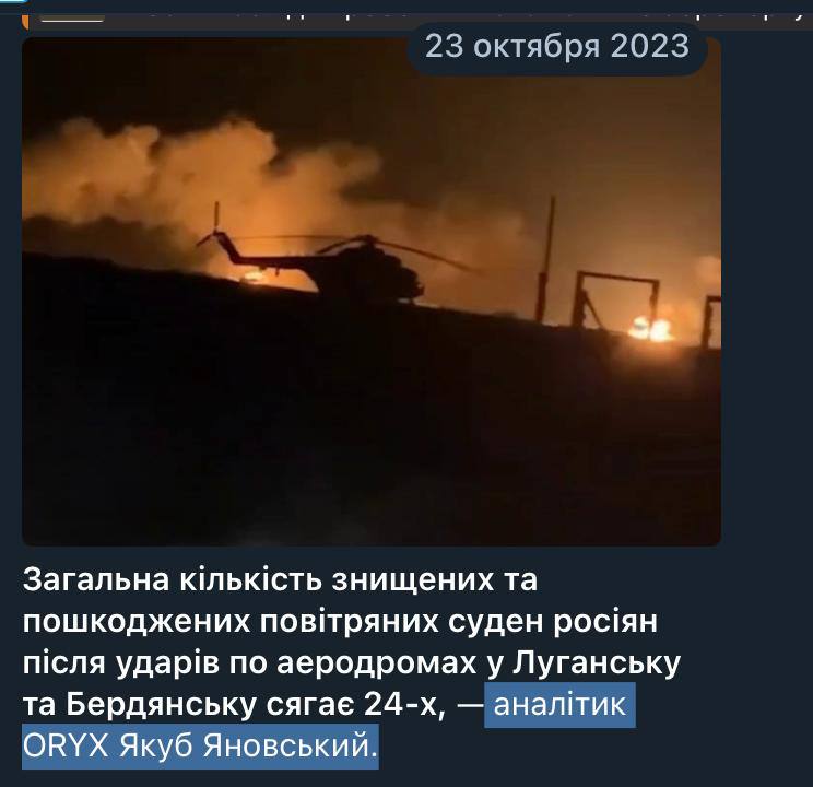 Однако этот ролик старый и на самом деле снят в октябре 2023 года. На кадрах, как тогда писали СМИ - последствия удара ракет ATACMS по российским вертолетам в Бердянске, выяснило украинское издание «Страна».