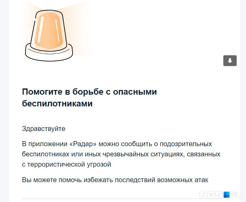 Новосибирцы получили рассылку от «Госуслуг» с призывом помочь в борьбе с беспилотниками. В письме предлагается установить приложение «Радар».