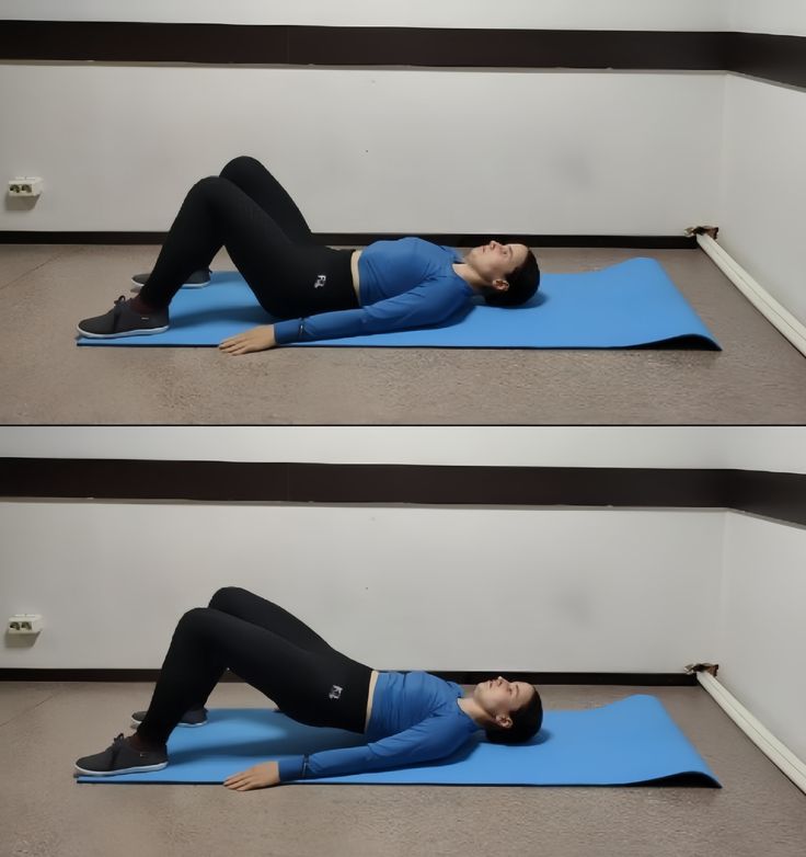 - Лягте на коврик, поясница прижата к полу. Ноги расставьте на ширине плеч, стопы плотно уприте в пол. Лопатки сведите.