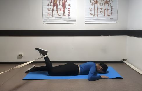 - Лягте на живот, один конец фитнес-резинки зафиксируйте на опоре, а другой — на голени одной ноги.