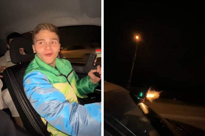 На кадрах, опубликованных в телеграм-канале «Богдан Киселев», видно, что в машине по Димитровскому мосту едет компания парней. 19-летний водитель Богдан достает предмет, похожий на аэрозольный пистолет, и стреляет из него. После компания смеется.