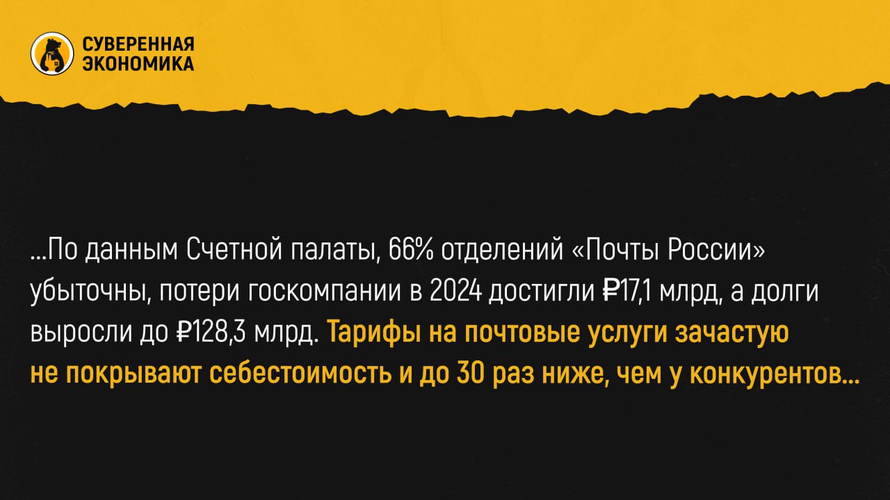 По данным Счетной палаты, 66% отделений «Почты России» убыточны, потери госкомпании в 2024 достигли ₽17,1 млрд, а долги выросли до ₽128,3 млрд. Тарифы на почтовые услуги зачастую не покрывают себестоимость и до 30 раз ниже, чем у конкурентов. Например, доставка 500-граммового письма по стране стоит у «Почты» ₽170, а у СДЭК — ₽455. При этом компания обязана обслуживать всю территорию страны, включая малонаселенные пункты.