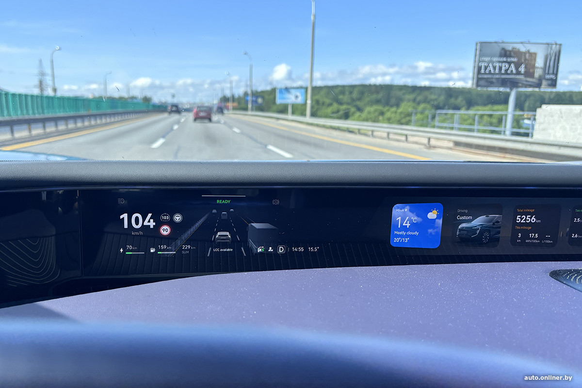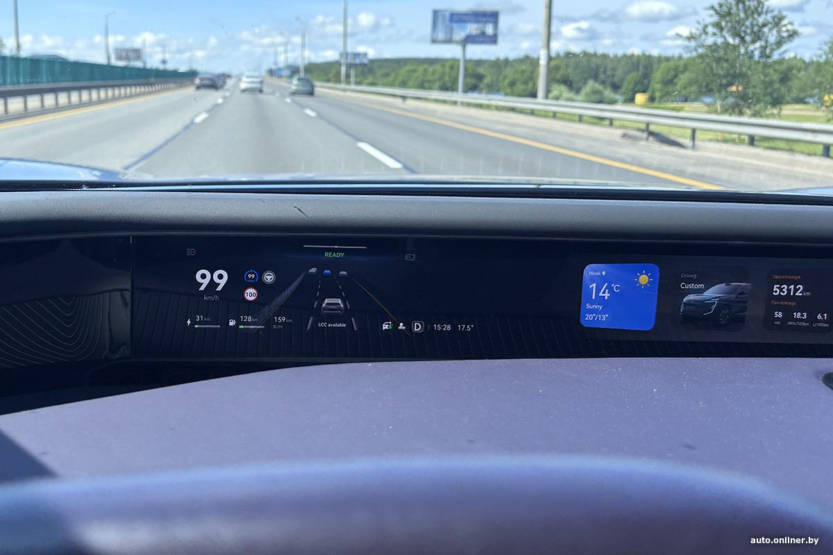 Напомним: максимальная емкость батареи в кроссовере — 39,05 кВт·ч (или 220 км «заводского» запаса хода). Чтобы узнать расход топлива, мы отправились на МКАД и сделали круг по внешнему кольцу, включив режим Electric only. По дороге старались придерживаться левой полосы на круиз-контроле, но периодически приходилось перестраиваться и притормаживать.