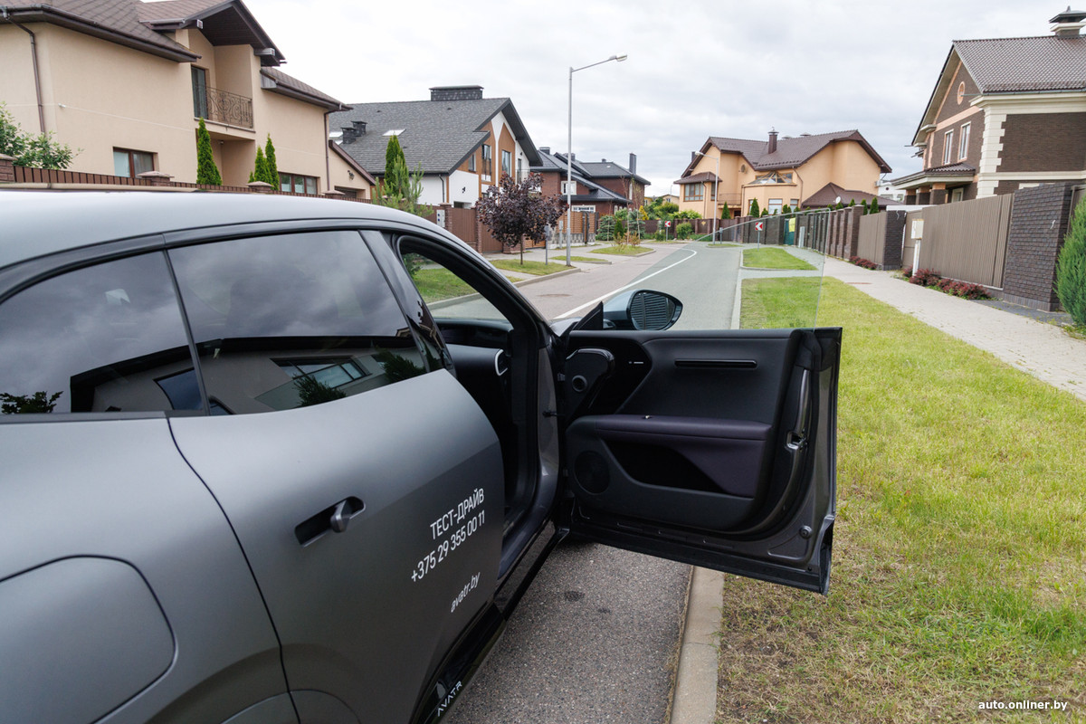 Версия, попавшая в наши руки, оснащена двумя электродвигателями — на передней и задней оси (492 л. с. в сумме). Производитель заявляет о 4,9 секунды до сотни (есть более быстрая электрическая версия — 3,9 секунды). Скажем так — охотно верим в эти цифры, если батарея заряжена. Машина разгоняется незаметно и плавно, но стремительно. Педаль газа отзывчивая: то, что со скоростью случился перебор, становится понятно только при взгляде на приборку и попутные автомобили, которые быстро остаются позади.