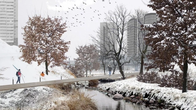 Центральной осью парка станет пешеходная и велодорожка, совмещенная с техническим проездом из асфальтобетона мостом. В средней зоне должны появиться детские площадки, место для проведения эко-уроков и спортивная зона. На наиболее пологой территории благоустроят место для пикников, а на одном из склонов, где перепад рельефа существенный, но не экстремальный, благоустроят скалодром для детей.