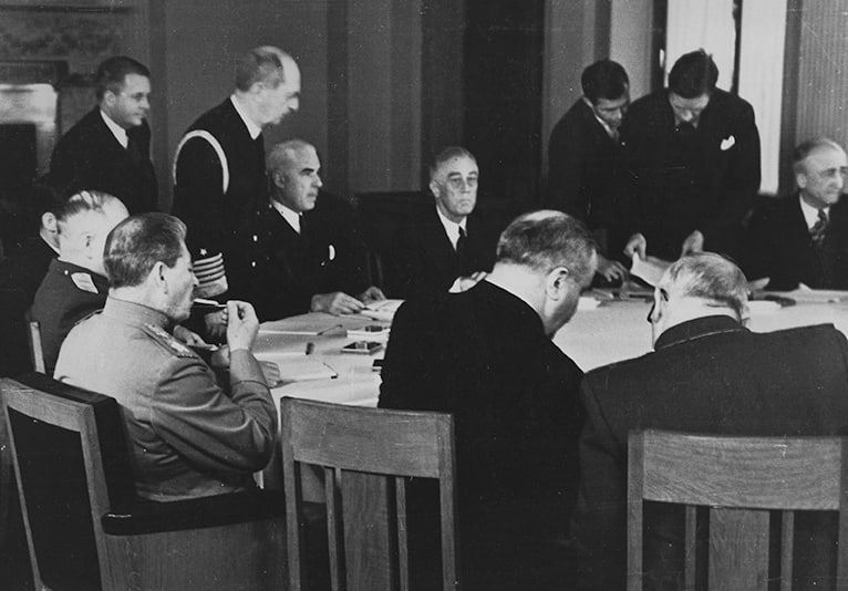 На протяжении нескольких часов союзники пытались уговорить Сталина одобрить этот пункт — иначе, мол, малые страны заподозрят их в стремлении установить мировое господство, сама мысль о котором, конечно, категорически чужда англичанам и американцам.